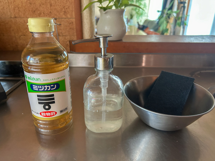 用意するのは、お酢と食器洗い洗剤、そして水。