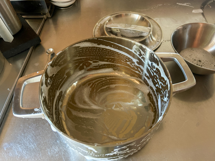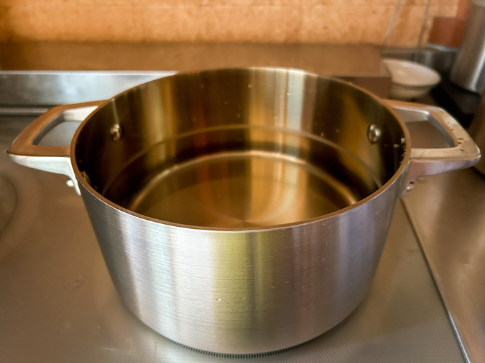 わが家の場合、新品のステンレス鍋の使い始めは、ピカピカすぎて眺めていたい気持ちになって少し勇気がいるので、まずは手始めにお湯を沸かしてみました。